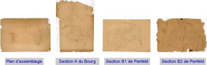 - de feuilles de section (désignées par une lettre ou par une lettre et un chiffre) représentant des parties du territoire communal et où figurent les limites des parcelles, celles-ci étant désignées par un numéro.