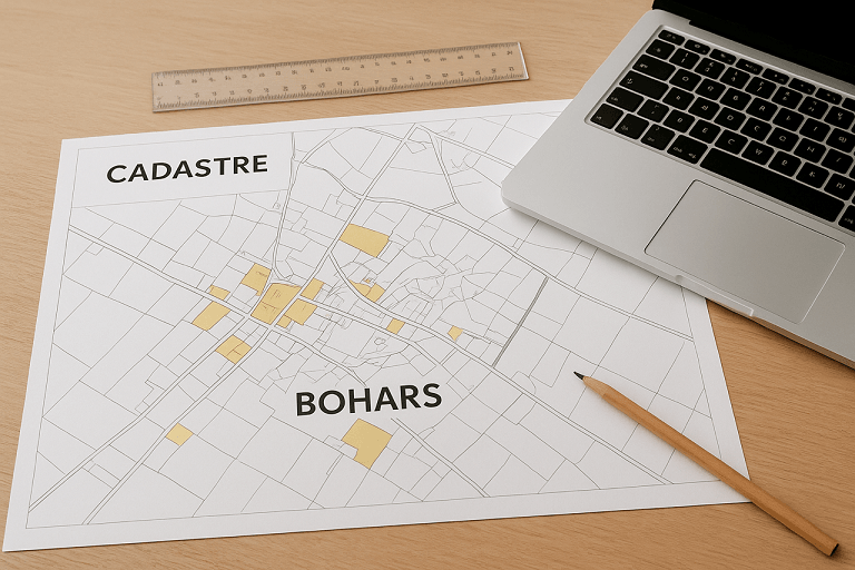 Le plan cadastral, levé par un géomètre, est la représentation géographique, à grande échelle, du territoire d’une commune, il est constitué :